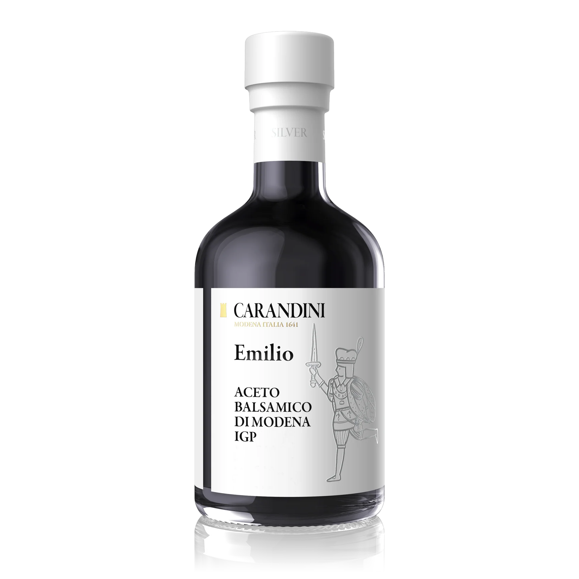 Emilio Argento by Carandini is a refined Balsamic Vinegar of Modena IGP, crafted with a balanced blend of cooked grape must and wine vinegar. Aged and produced according to tradition, it offers a rich, velvety texture and a harmonious sweet-and-sour flavor. Its deep aroma and smooth finish make it ideal for enhancing salads, roasted vegetables, grilled meats, and even desserts. Made by the historic Carandini family, known for their vinegar mastery since 1641, this balsamic brings elegance and authenticity to any dish.