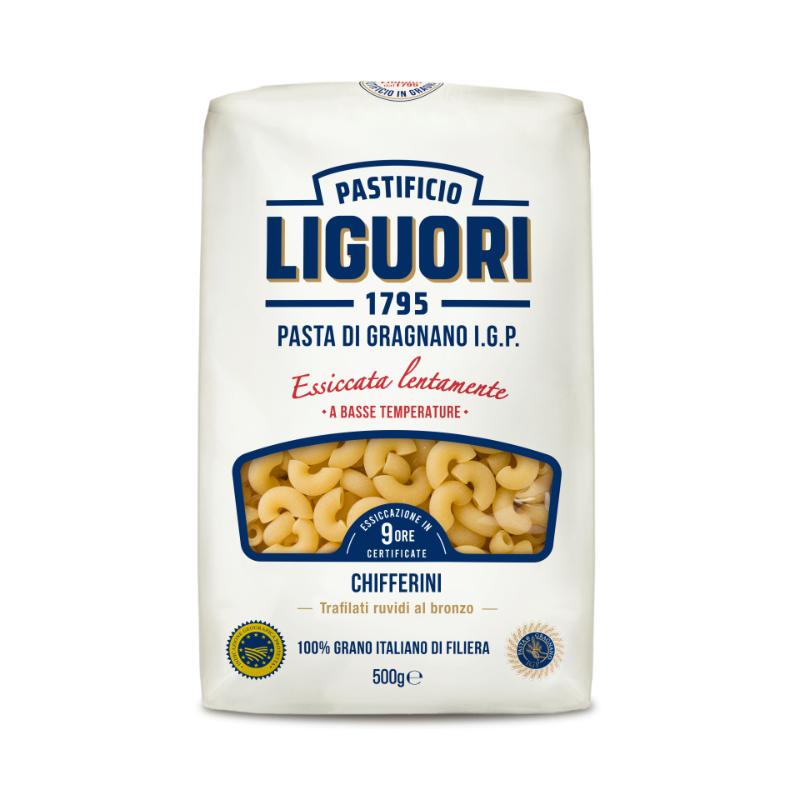 Chifferini 500g – LIGUORI is a traditional Italian pasta made from 100% high-quality durum wheat semolina, expertly crafted in Gragnano — a town celebrated for its centuries-old pasta-making heritage. Chifferini, a small curved tubular pasta similar to elbow macaroni but slightly larger and often ridged, is perfect for capturing sauces inside and out.