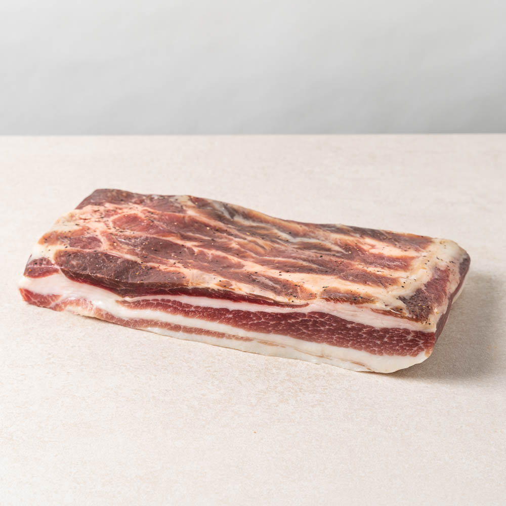 Pancetta Flat Delicatesse a lightly cured, flat-cut Italian pork belly (pancetta stesa) from Villani, seasoned with salt and mild spices. It offers a harmonious fat-to-meat ratio and a softly silky texture. Ideal thinly sliced and eaten as-is, or grilled to enhance its savory richness